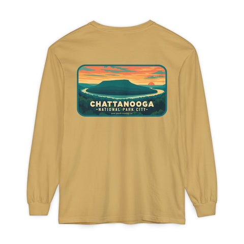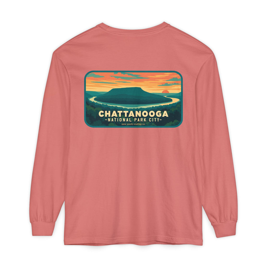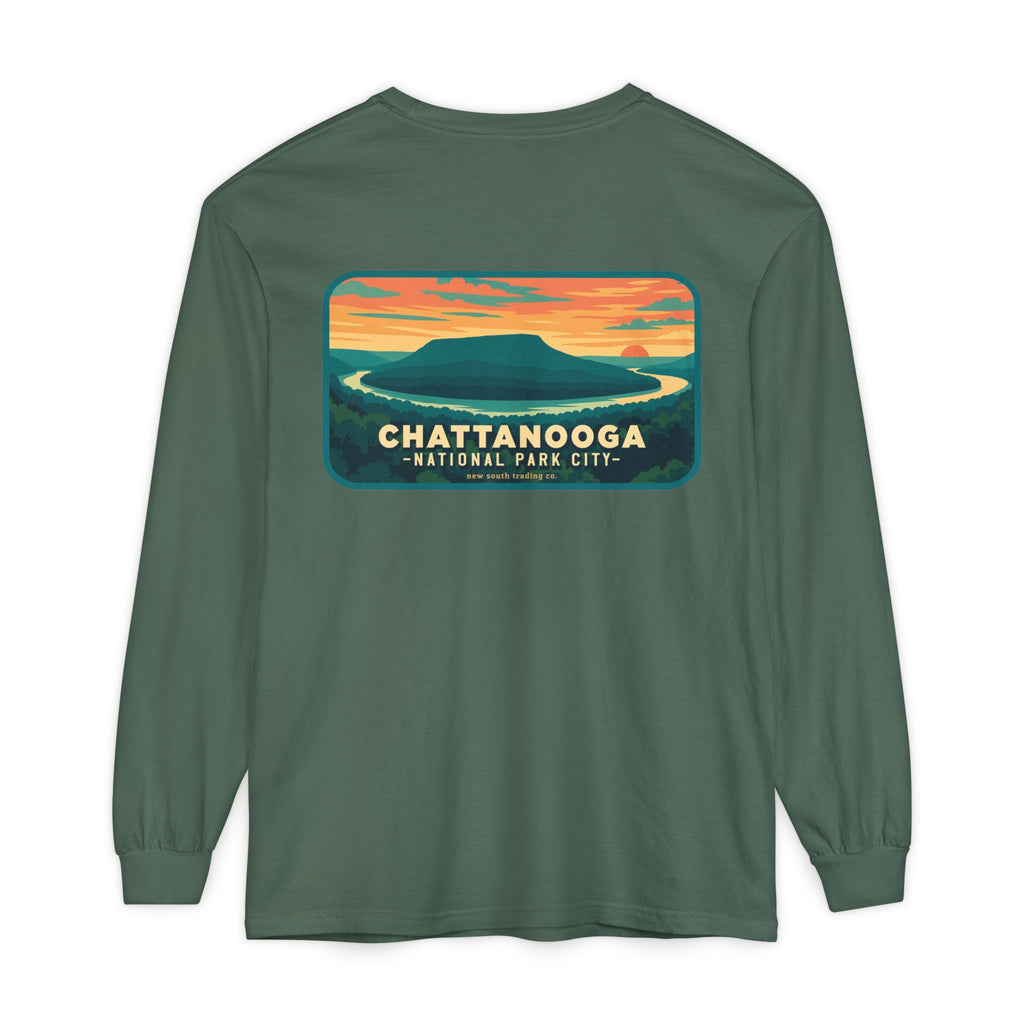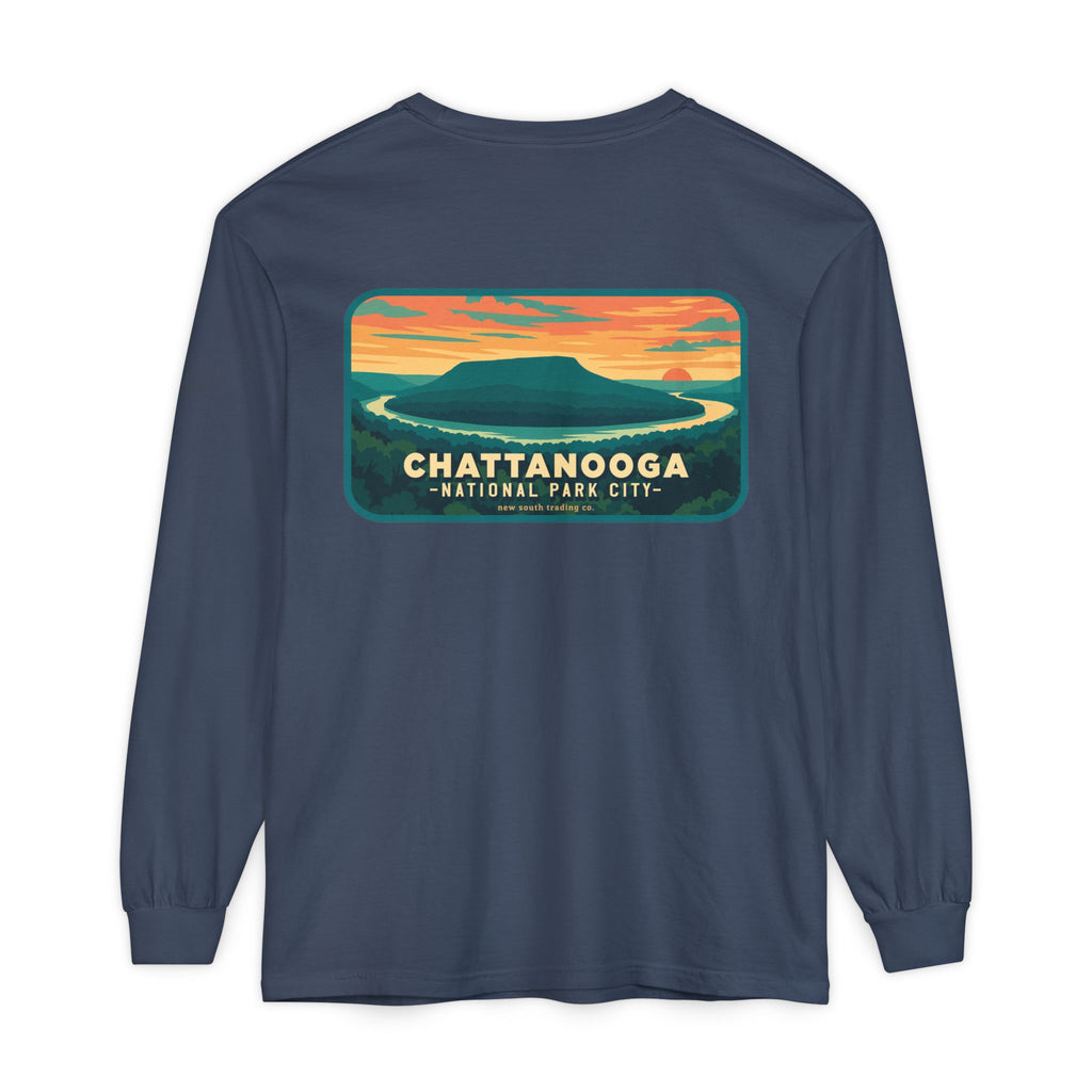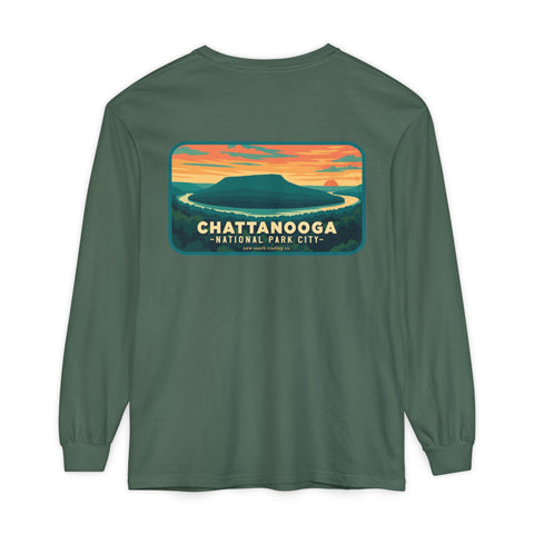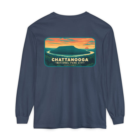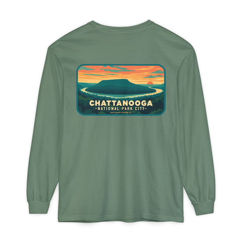 Snooper’s Rock Overlook – Chattanooga National Park City This postcard-style illustration features the awe-inspiring view from Snooper’s Rock, overlooking the Tennessee River Gorge. Framed by layers of mountains and a glowing sunset, this design captures the peaceful, panoramic beauty that makes Chattanooga a true National Park City.