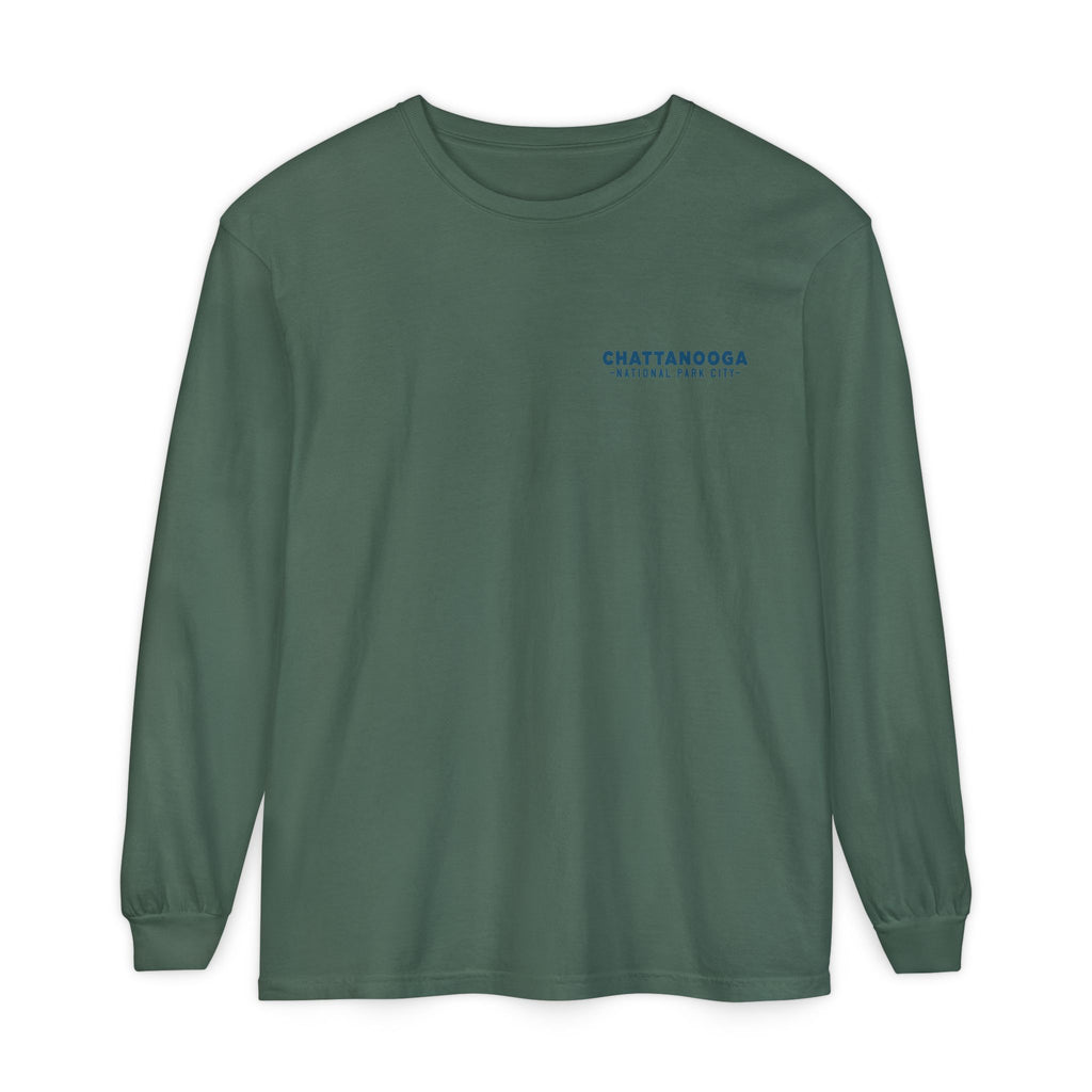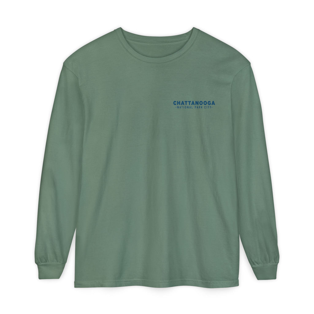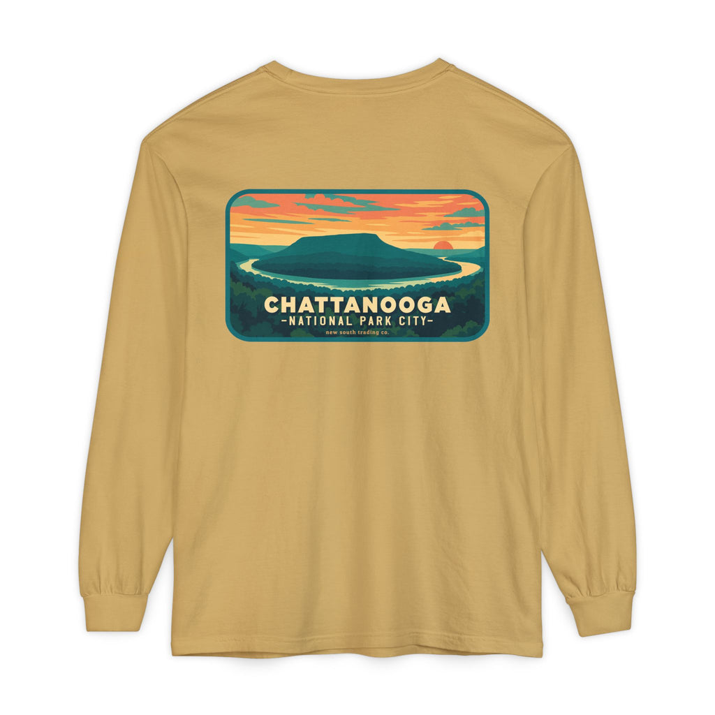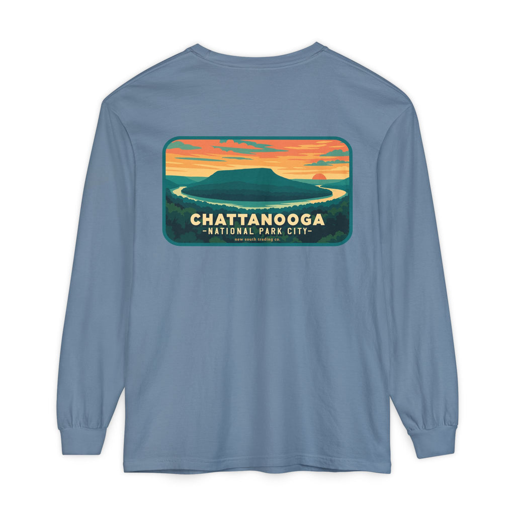 Snooper’s Rock Overlook – Chattanooga National Park City This postcard-style illustration features the awe-inspiring view from Snooper’s Rock, overlooking the Tennessee River Gorge. Framed by layers of mountains and a glowing sunset, this design captures the peaceful, panoramic beauty that makes Chattanooga a true National Park City.