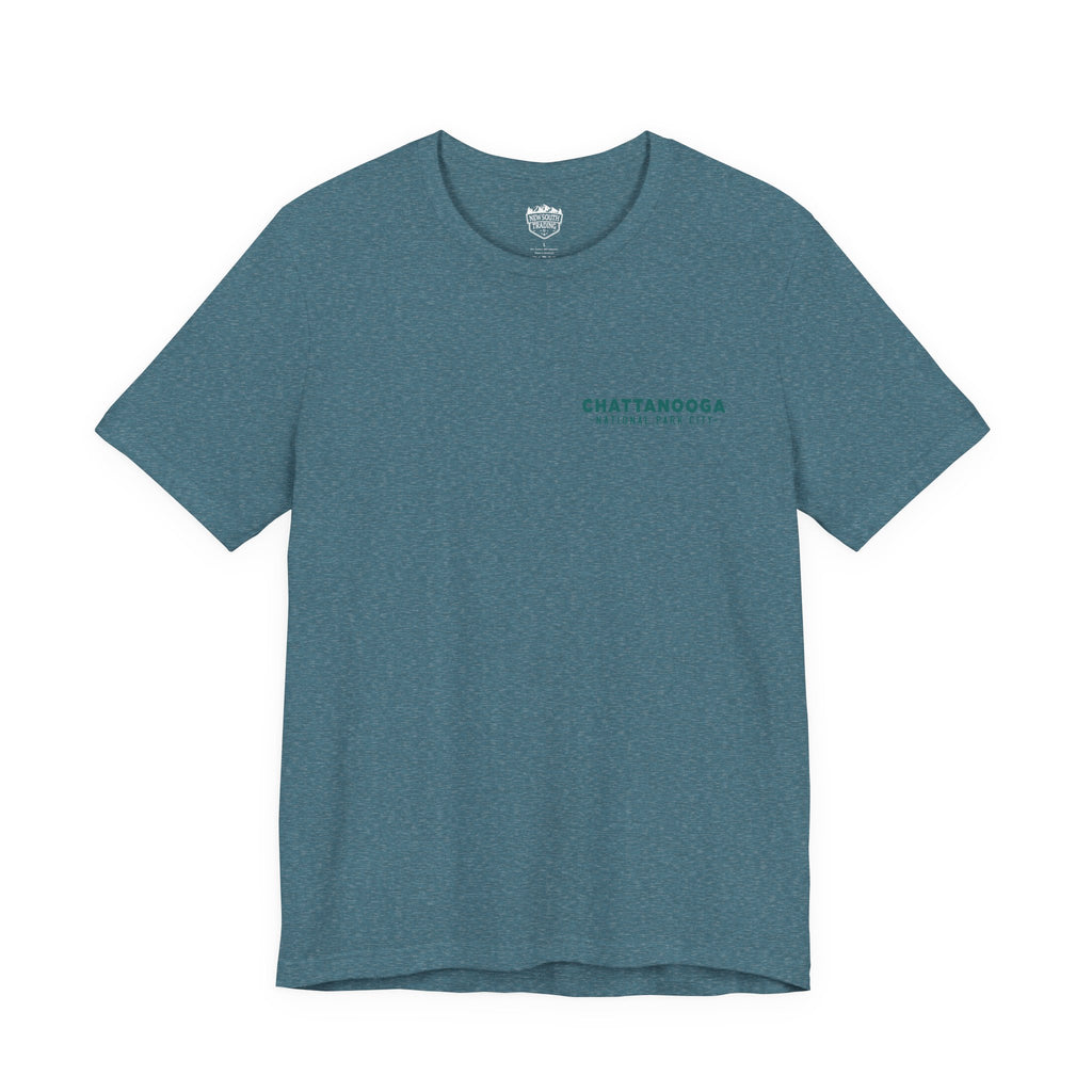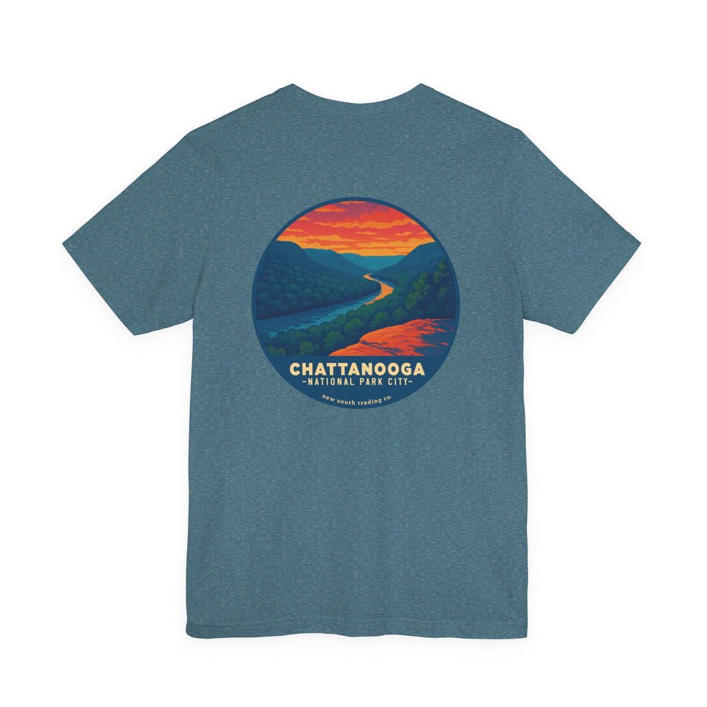 River Gorge Sunset – Chattanooga National Park City Vibrant and bold, this design captures the stunning beauty of the Tennessee River Gorge at golden hour. With a fiery sky fading into cool mountain shadows, it's a perfect tribute to Chattanooga's breathtaking natural views. Designed with color lovers in mind, this piece is a true standout in the collection.