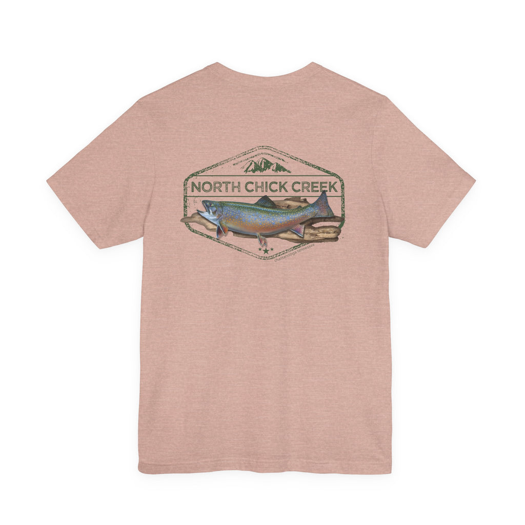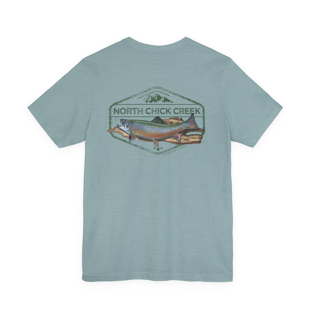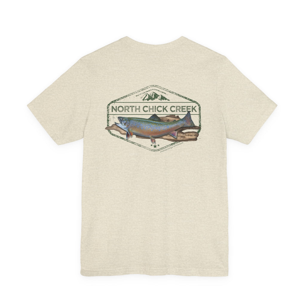 Celebrate the wild spirit of North Chickamauga Creek. Featuring a beautifully detailed rainbow trout illustration framed by vintage-style typography, this T-shirt honors the rushing waters, rugged rock ledges, and timeless memories of days spent hiking, swimming, and casting a line.