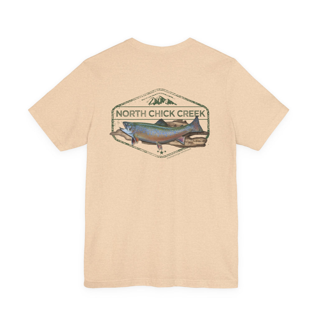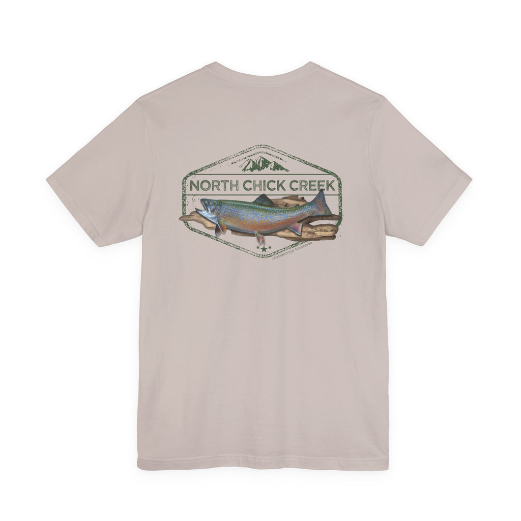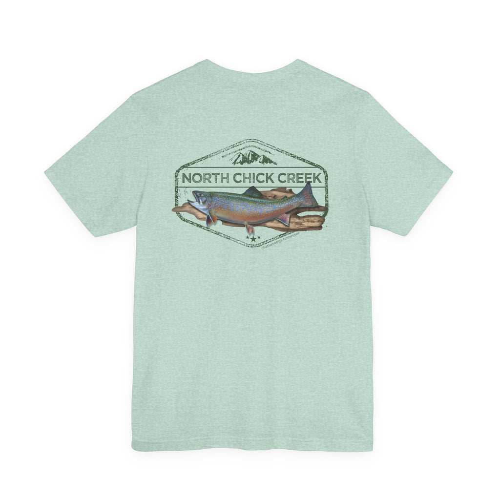 Celebrate the wild spirit of North Chickamauga Creek. Featuring a beautifully detailed rainbow trout illustration framed by vintage-style typography, this T-shirt honors the rushing waters, rugged rock ledges, and timeless memories of days spent hiking, swimming, and casting a line.